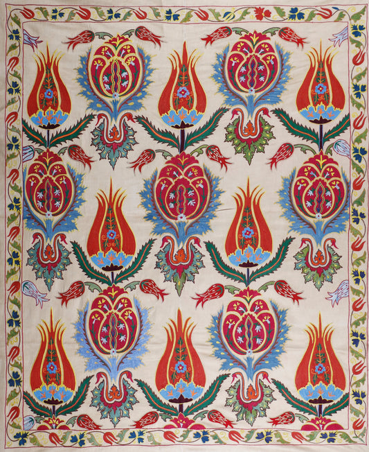 Ottoman Silk Red Tulip Embroidered Suzani Tapestry