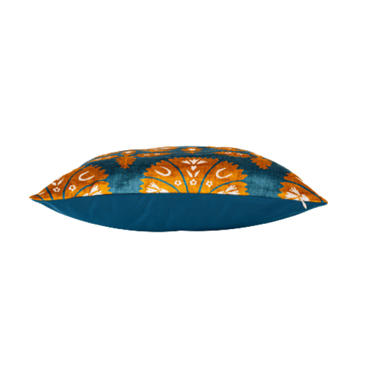 Silk Ikat Velvet Blue and Yellow Ottoman Carnation Cushion