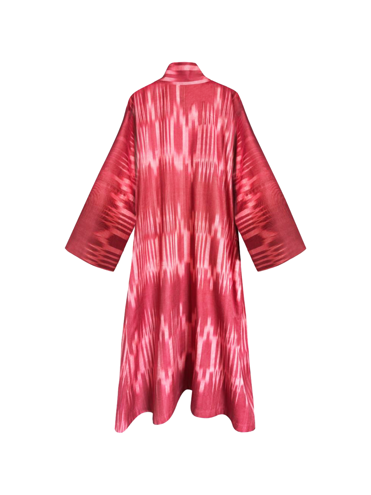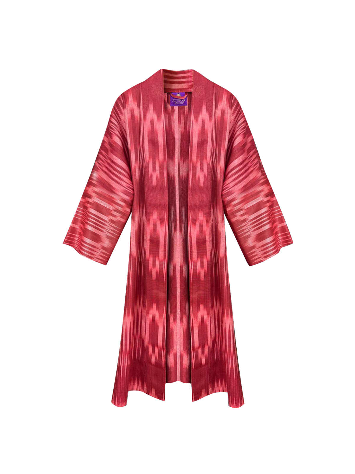 The intricate burgundy ikat luxurious piece combines the rich heritage of Ottoman craftsmanship with the elegance of silk, resulting in a truly unique and timeless garment. The lightweight and breathable silk fabric ensures utmost comfort, making it perfect for any occasion. Whether you're lounging at home, attending a special event, or looking for a stylish layering piece, this kimono is sure to elevate your style and make a statement.