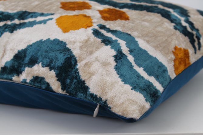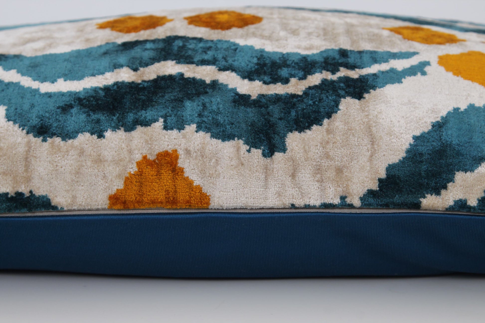 Ottoman chintamani ikat velvet cushion with a zipped cover from silk velvet with a plain OEKOTEX® fabric. The fabric is resist-dyed, hand-woven and hand-dyed. The unique motif on front side of this decadently pigmented cushion demonstrates the capabilities and beauty of ikat weaving.