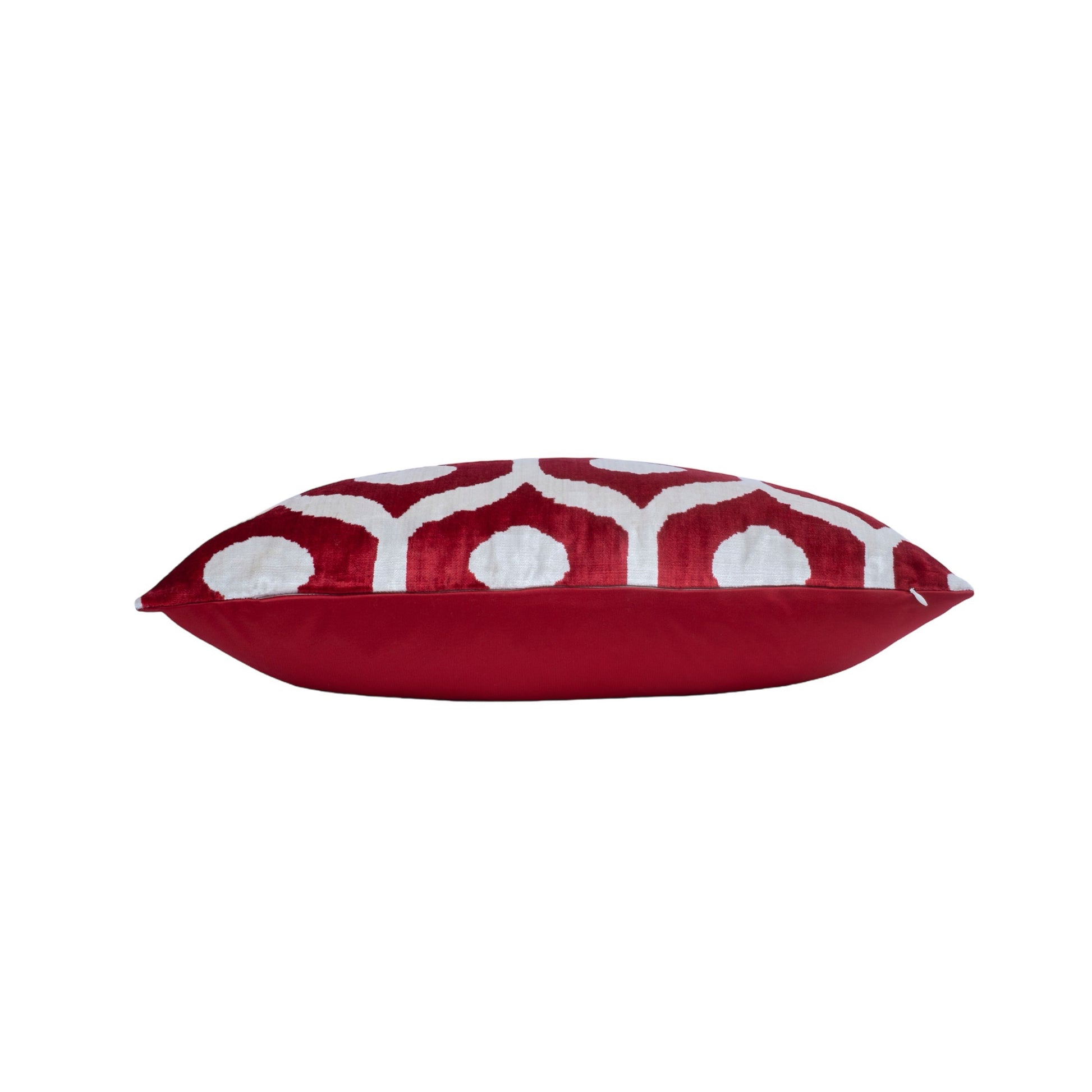 A rectangular ikat velvet cushion with a zipped cover from silk velvet with a plain dark red OEKOTEX® fabric. The fabric is resist-dyed, hand-woven and hand-dyed. The historic motif on front side of this decadently pigmented cushion demonstrates the capabilities and beauty of ikat weaving.