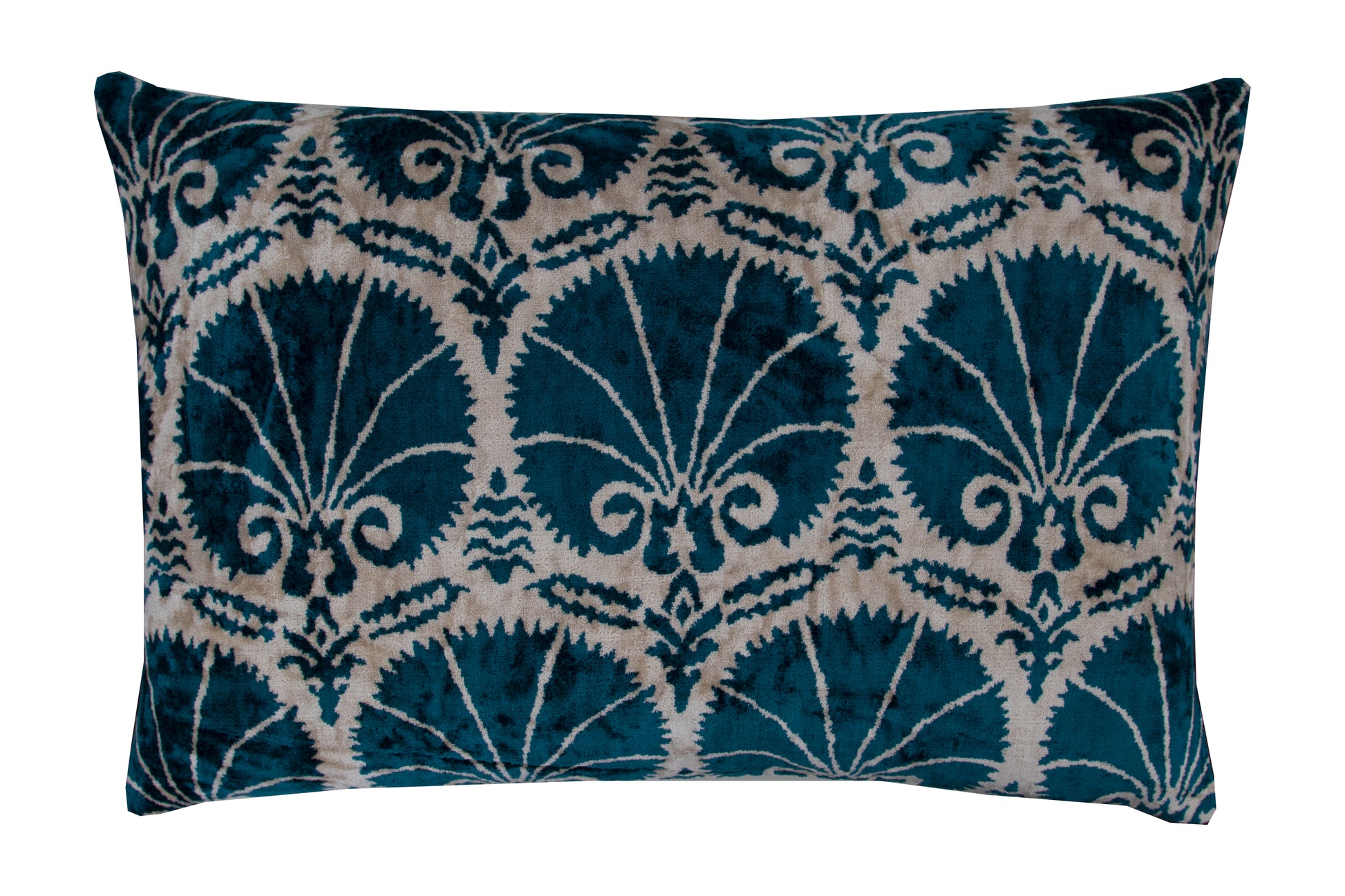 Silk Ikat Velvet Ocean Blue and White Carnation Cushion