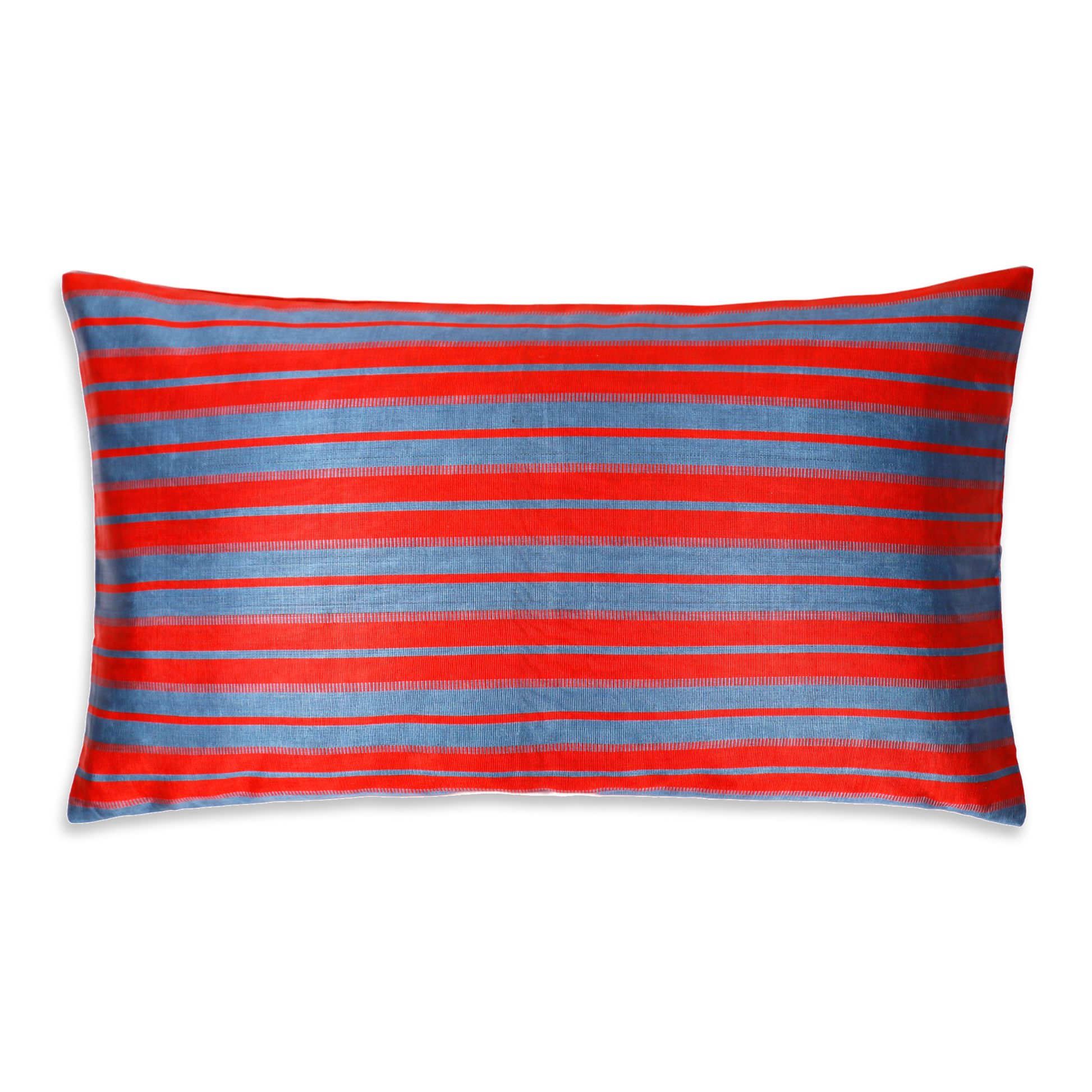 Traditionally handwoven stripes kutnu fabric with high silk ratio is resilient and has a soft, luxurious feel. Glamorous combination of red and blue silk handwoven cushion has unique historic stripes which introduces the concept of style and design in 600 years Ottoman culture.