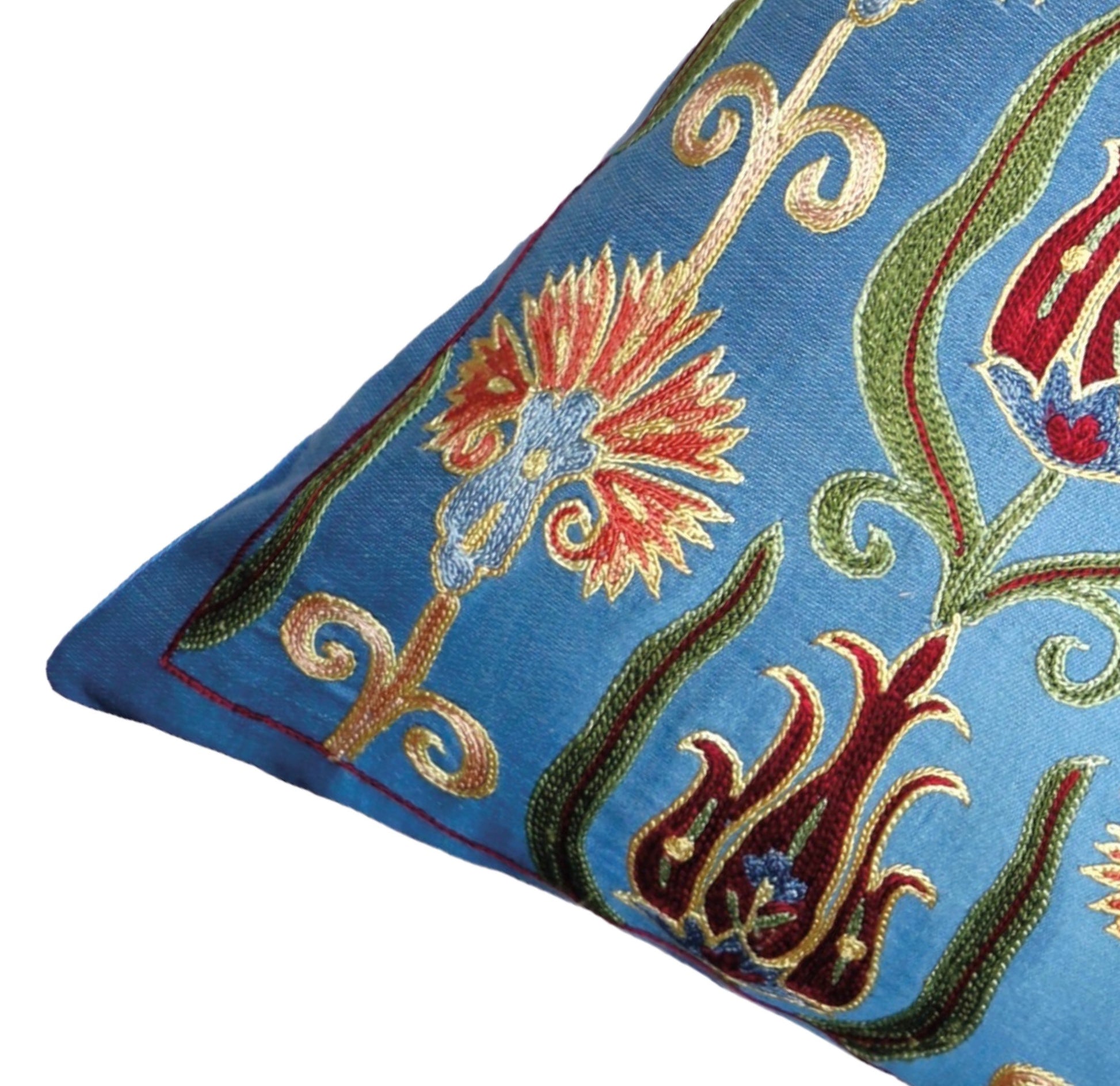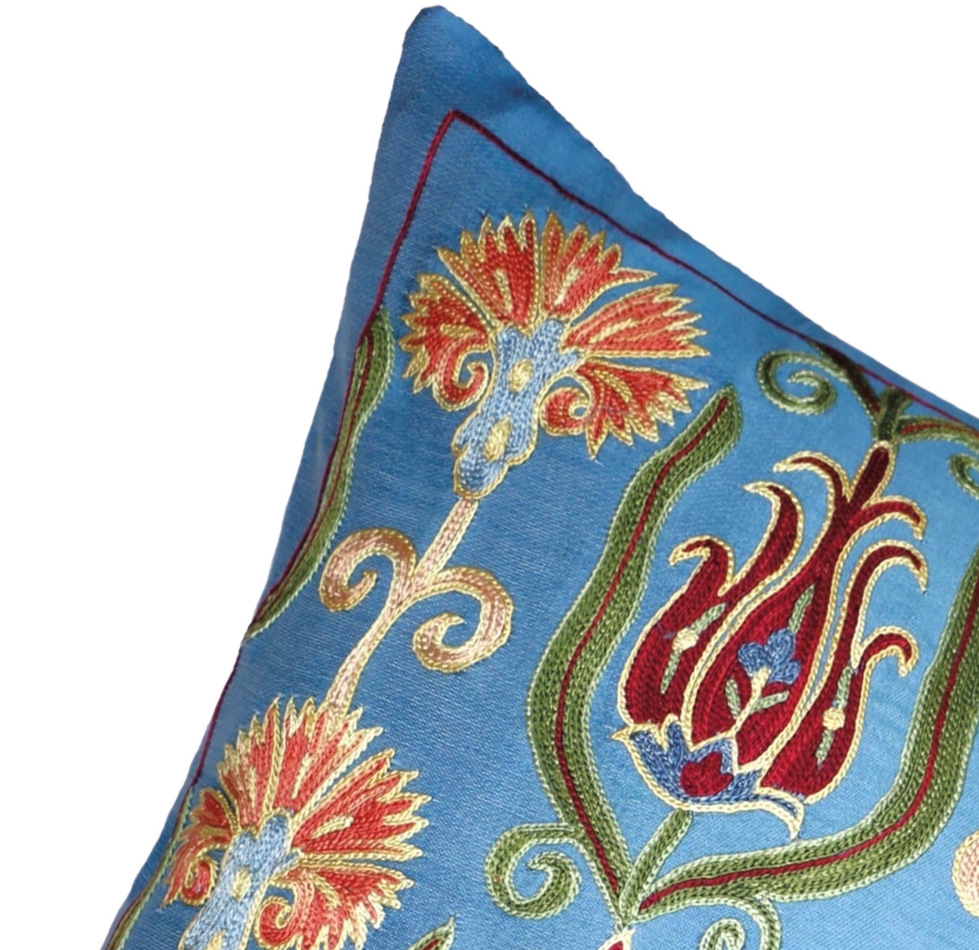 Silk Embroidered Suzani Blue Ottoman Garden Cushion