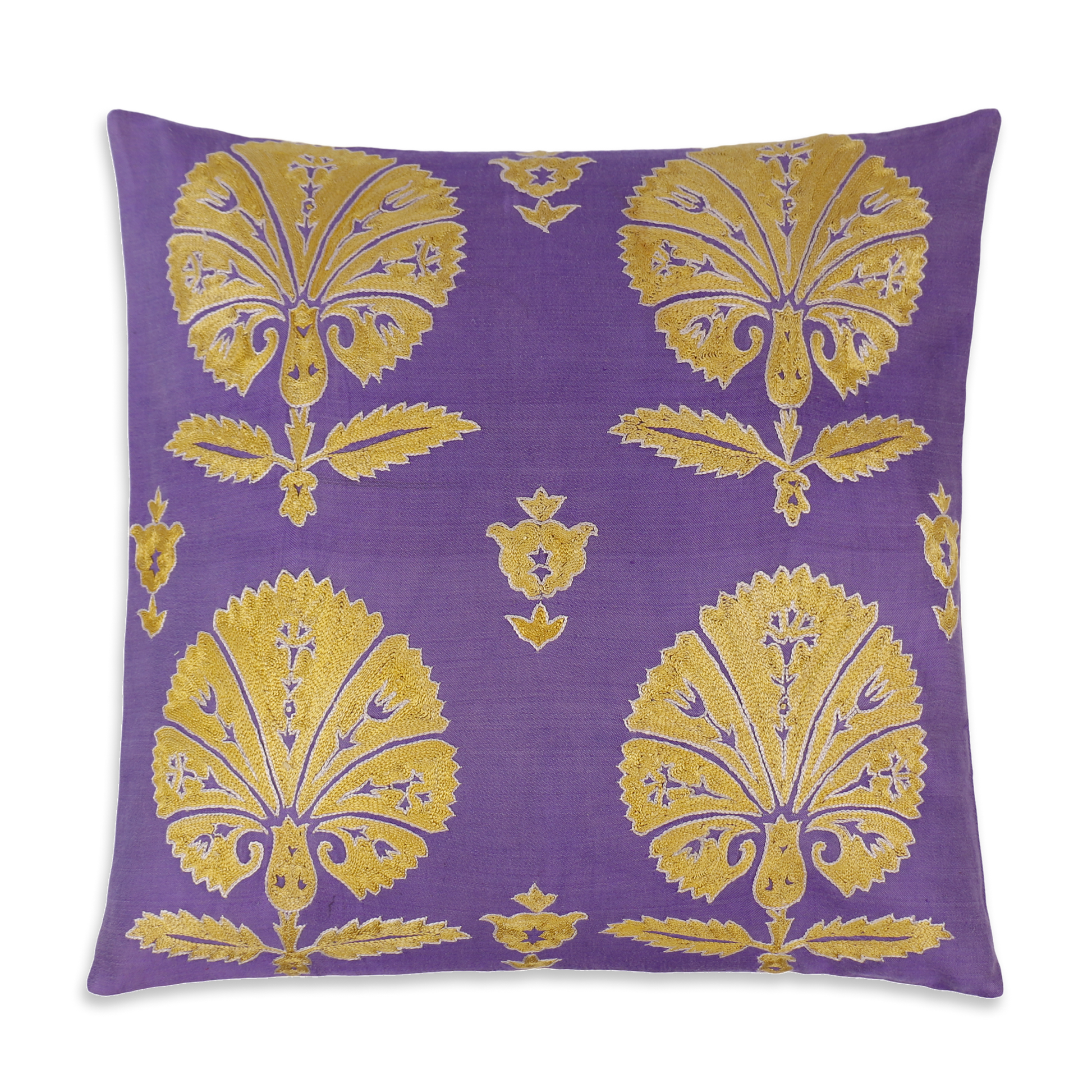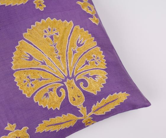 One of the unique piece of the limited-edition Ottoman Touch Collection, suzani cushion of yellow carnations embodies the purple colour of the fabric that pass along the 600 years history. Its symmetrical composition lends the highly decorative embroidery a more hand-crafted quality.