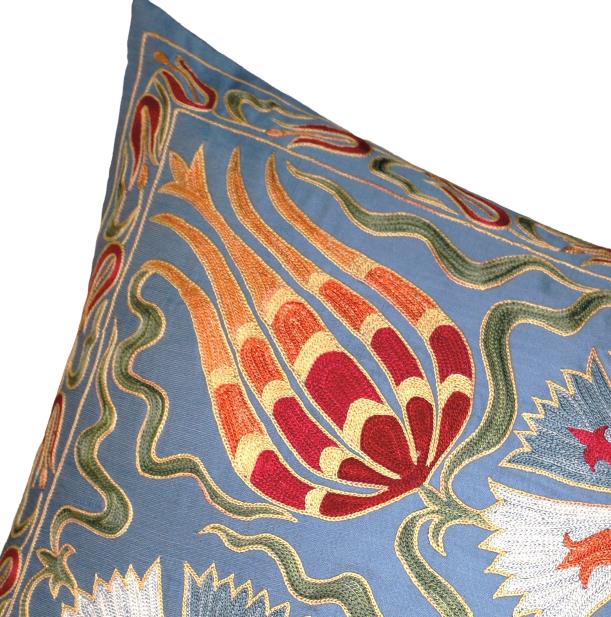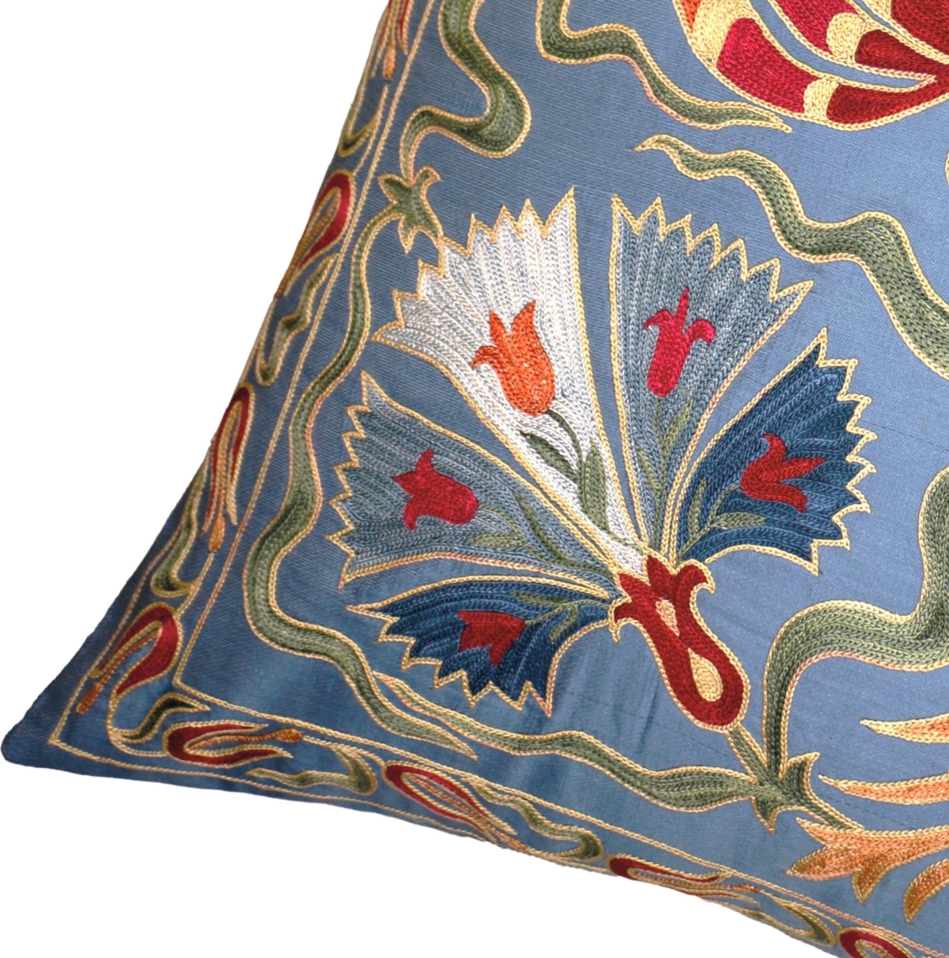 Silk Embroidered Suzani Blue Tulip and Carnation Cushion