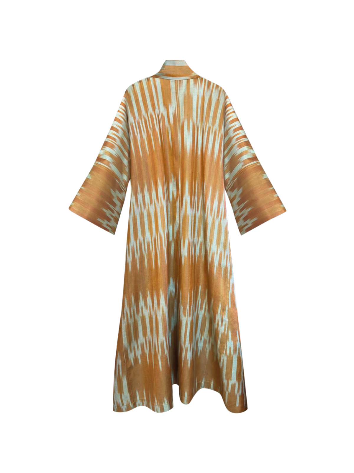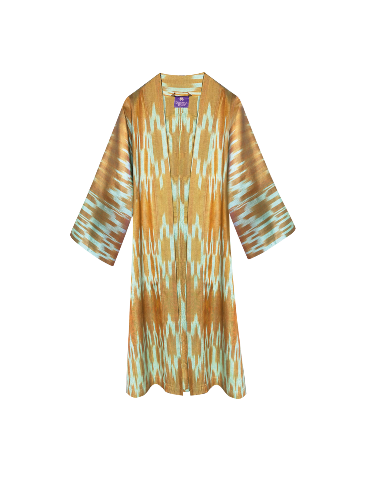 The intricate yellow and green ikat kaftan luxurious piece combines the rich heritage of Ottoman craftsmanship with the elegance of silk, resulting in a truly unique and timeless garment. The lightweight and breathable silk fabric ensures utmost comfort, making it perfect for any occasion. Whether you're lounging at home, attending a special event, or looking for a stylish layering piece, this kimono is sure to elevate your style and make a statement.