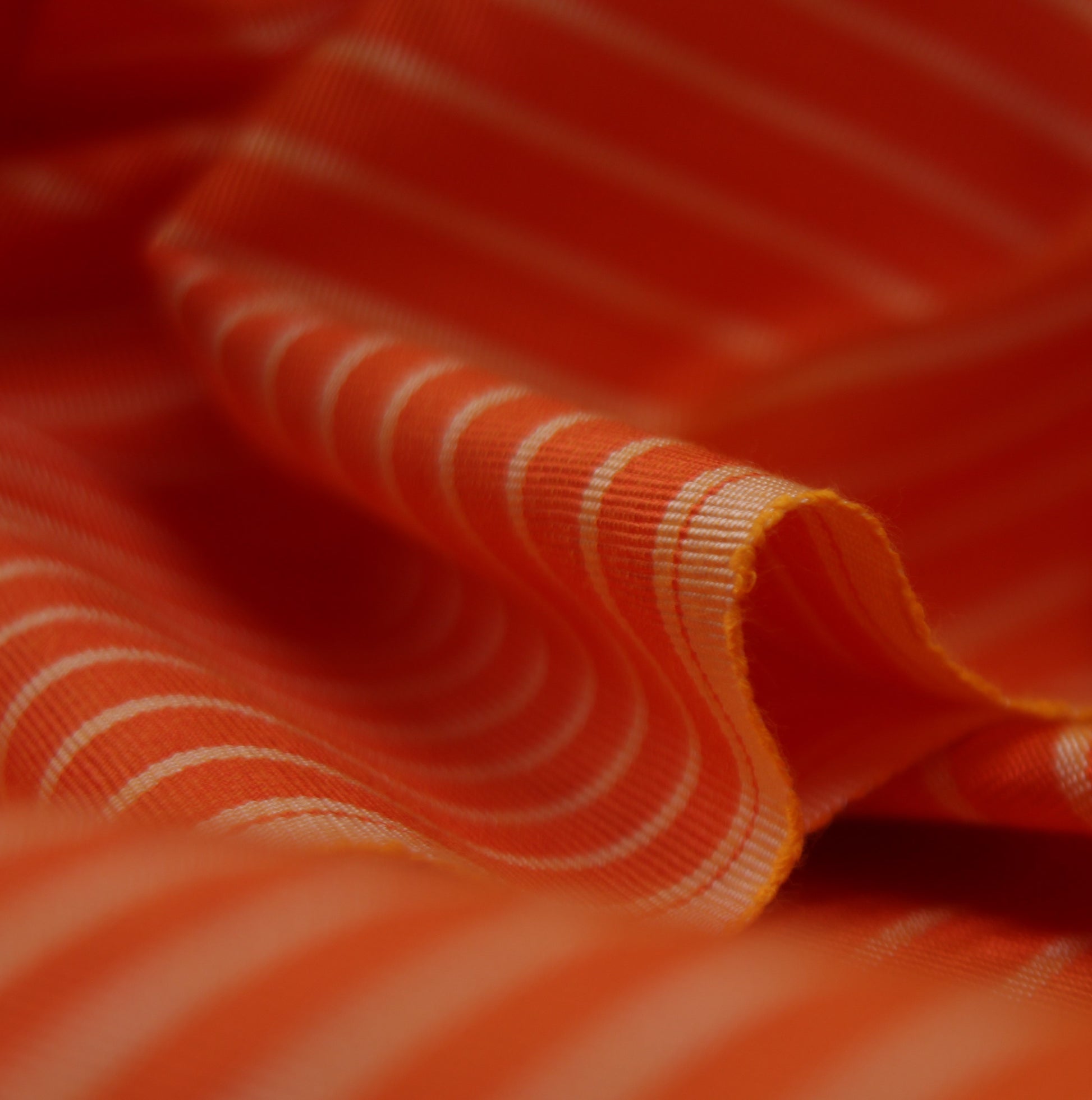 Traditionally handwoven orange stripes kutnu fabric with high silk ratio is resilient and has a soft, luxurious feel. It works wonders for upholstery projects, bedding, wall panels and more. This orange and white stripe fabric with bright stripes, designed exclusively for Ottoman Touch is inspired by the ancient fabrics of the Ottoman era.
