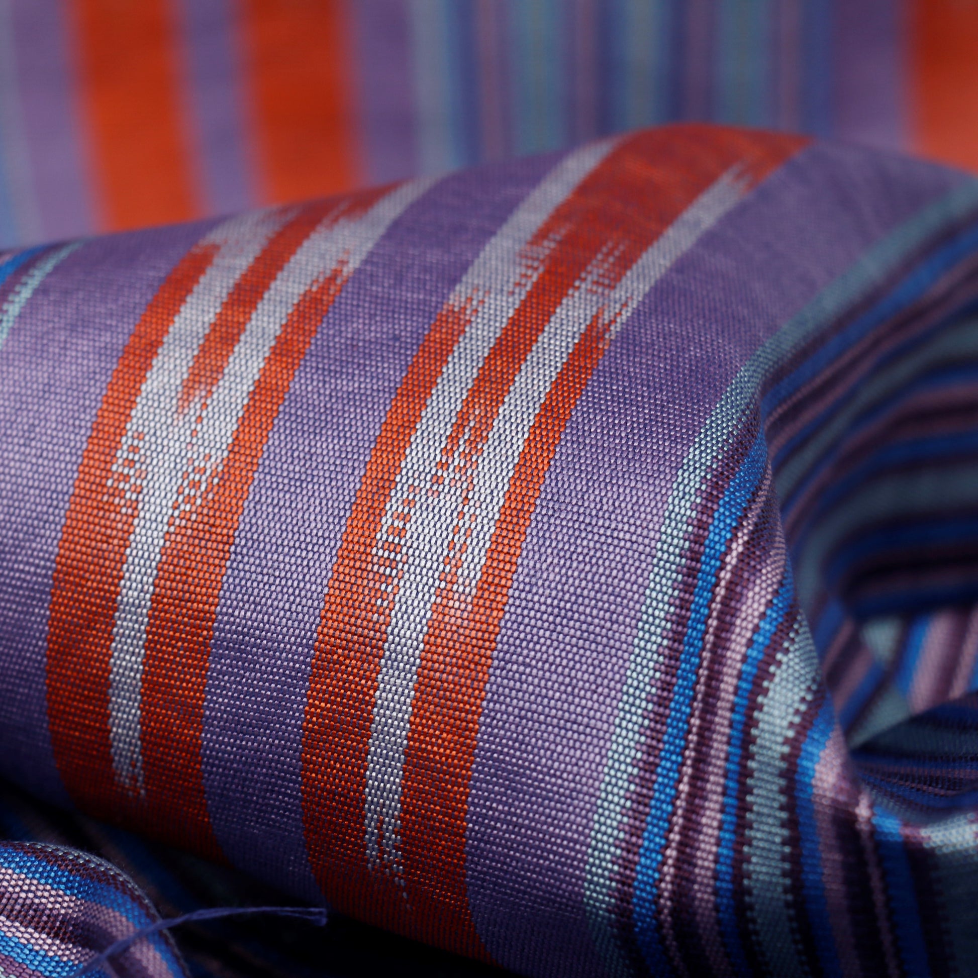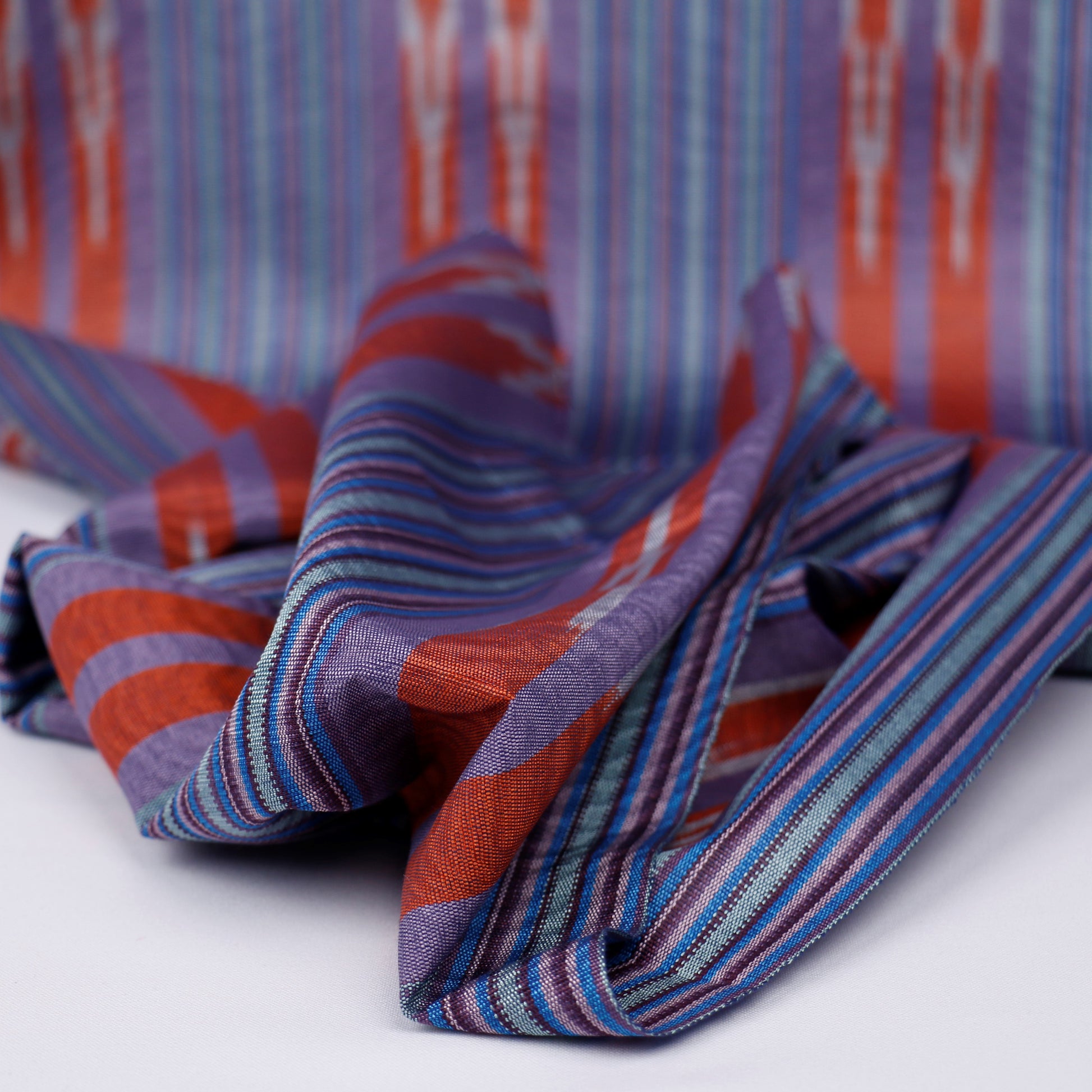 Traditionally handwoven purple ikat kutnu fabric with high silk ratio is resilient and has a soft, luxurious feel. It works wonders for upholstery projects, bedding, wall panels and more. This silk fabric with bright stripes, designed exclusively for Ottoman Touch is inspired by the ancient fabrics of the Ottoman era.