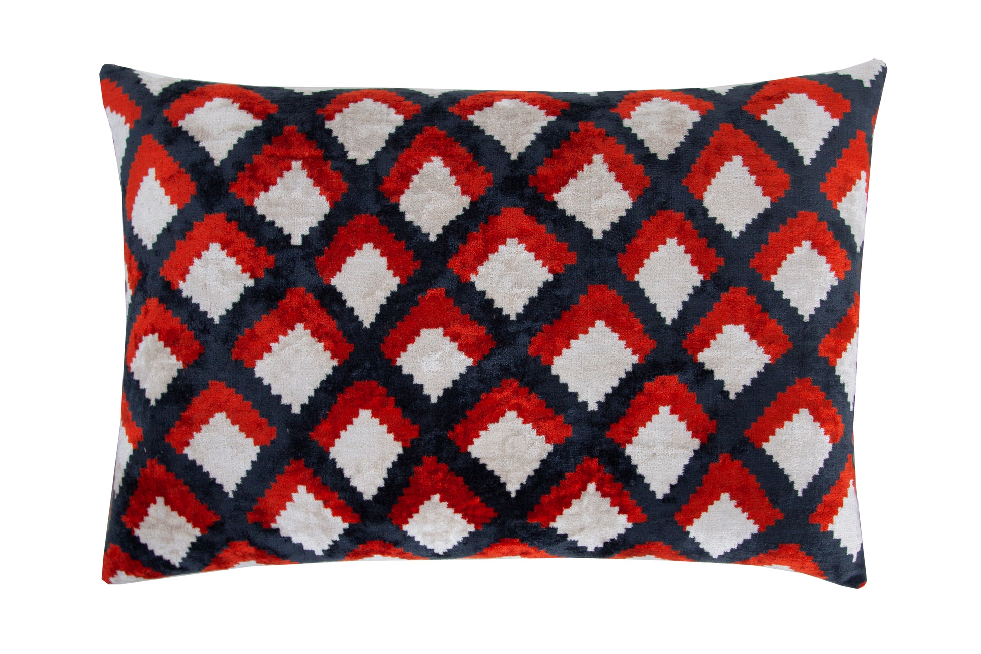 A rectangular ikat velvet cushion with a zipped cover from silk velvet with a plain red OEKOTEX® fabric. The fabric is resist-dyed, hand-woven and hand-dyed. The oriental motif on front side of this decadently pigmented cushion demonstrates the capabilities and beauty of ikat weaving.