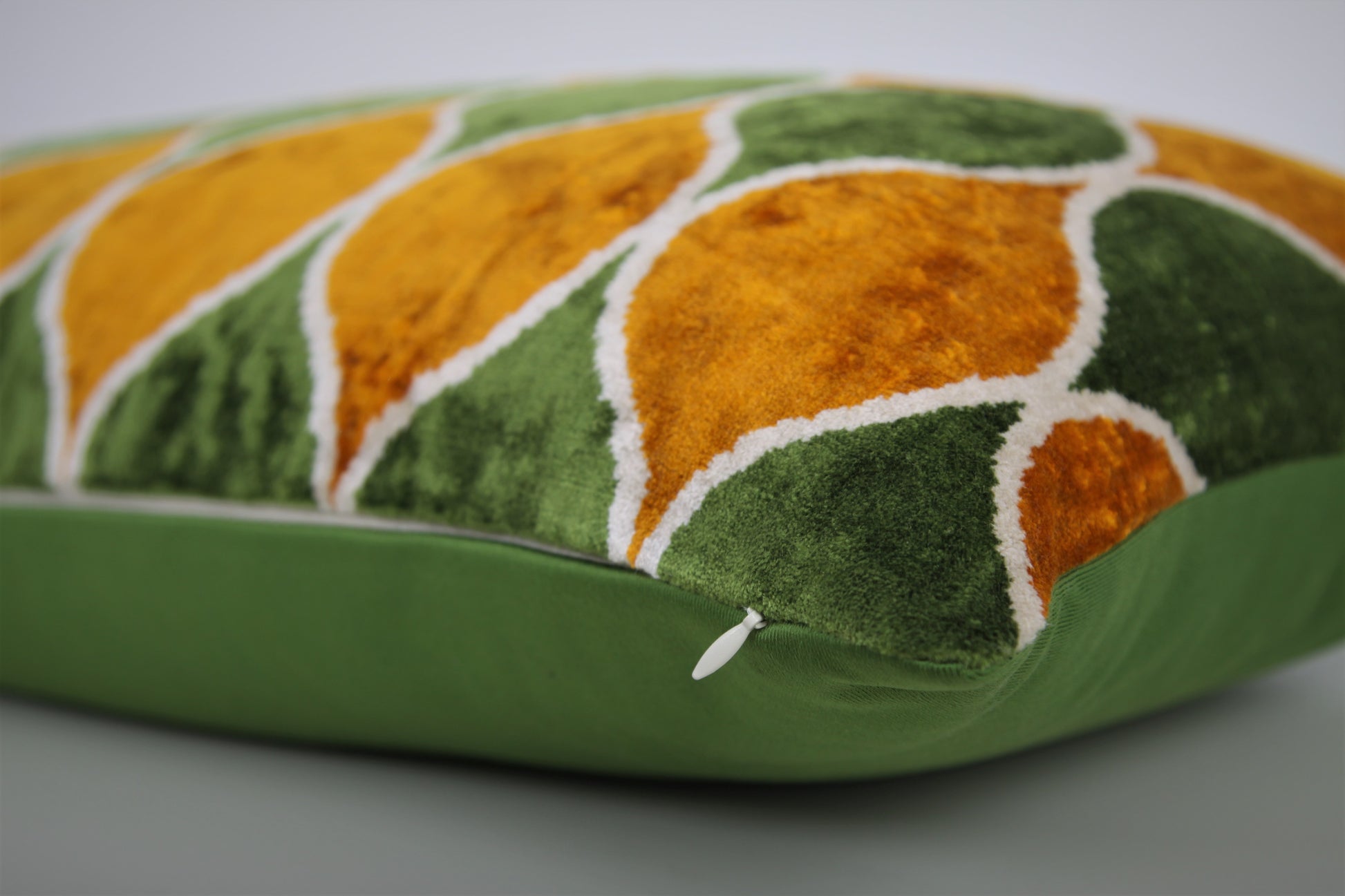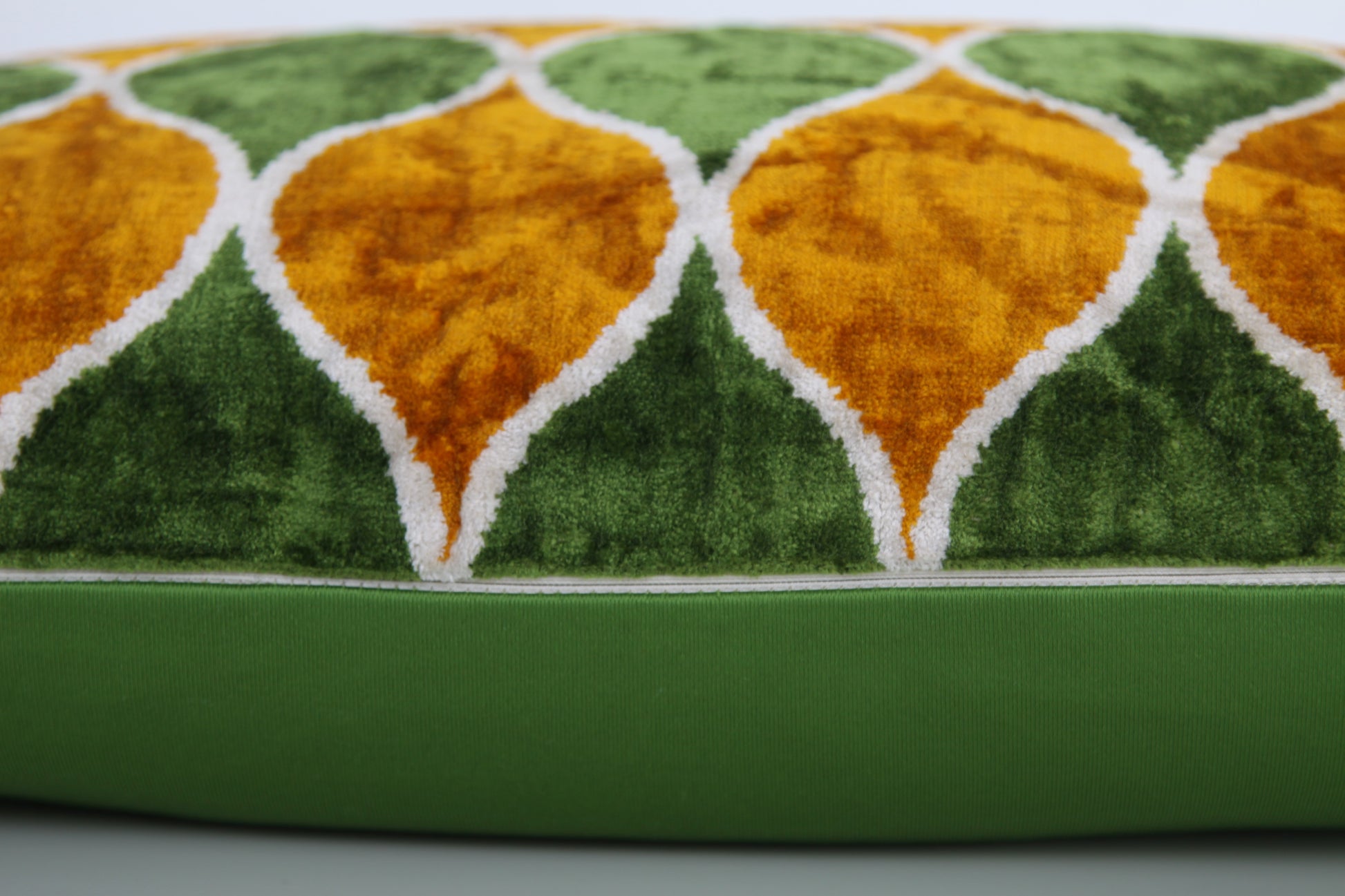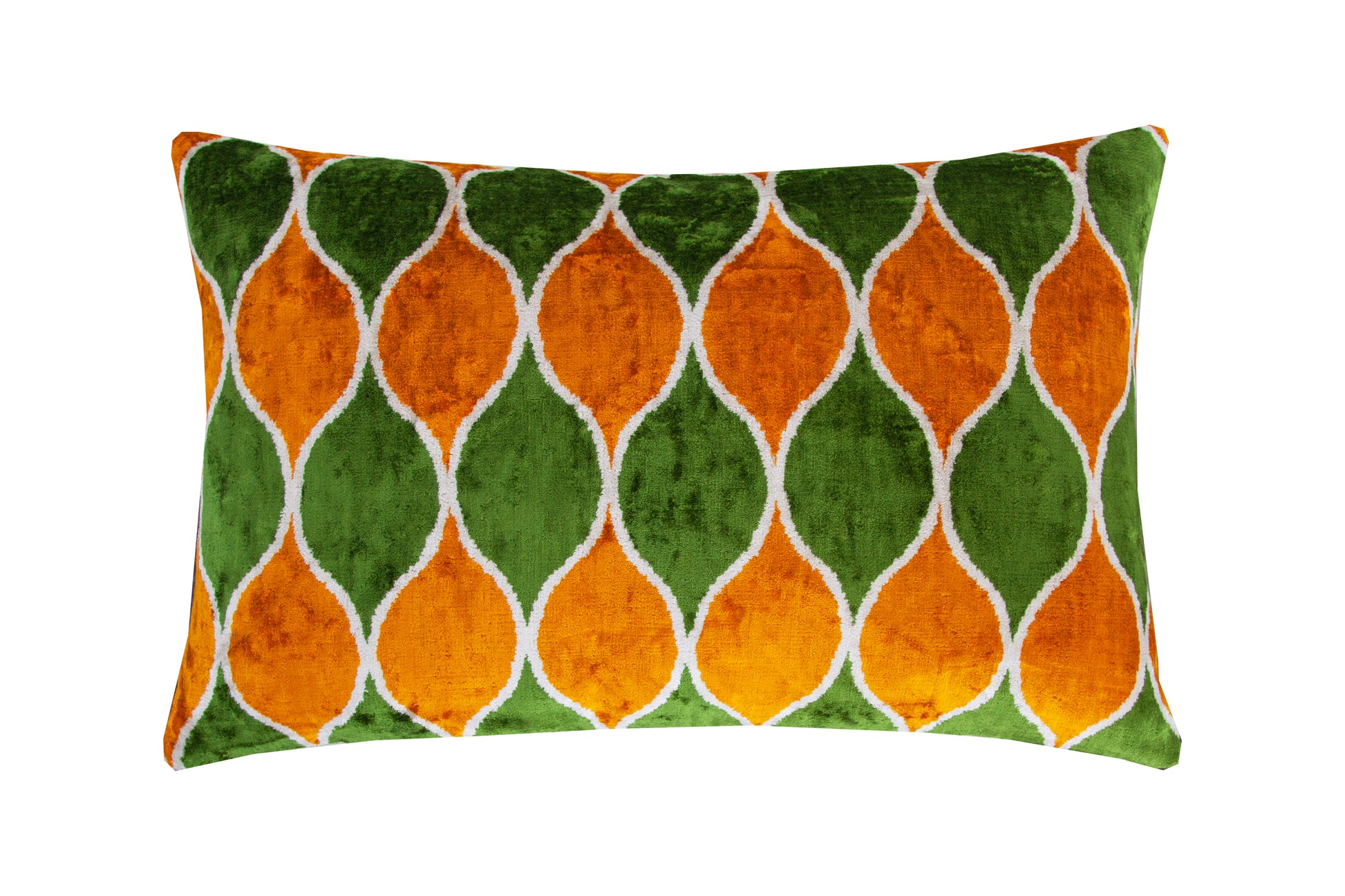 A rectangular ikat velvet cushion with a zipped cover from silk velvet with a plain dark pink OEKOTEX® fabric. The fabric is resist-dyed, hand-woven and hand-dyed. The oriental motif on front side of this decadently pigmented cushion demonstrates the capabilities and beauty of ikat weaving.